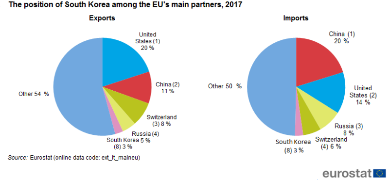The FINANCIAL – Logo Statistics ExplainedSouth Korea was the EU’s 8th largest partner for imports in 2017 (3 % of total extra-EU imports) and also the 8th largest for EU exports (3 % of total extra-EU exports).