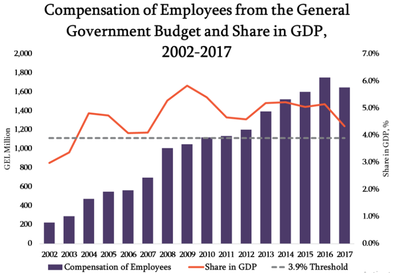 One of the most ambitious initiatives put forward by Bakhtadze was a promise to decrease governmental expenses, setting the cap at 3.9% of Georgian GDP. However, the specific nuances of this 3.9% threshold require further examination. Indeed, upon further inquiry, we have identified that the Prime Minister defines governmental expenses as the Compensation of Employees as classified in the budget of the generalgovernment (central, municipal, and autonomous republic).