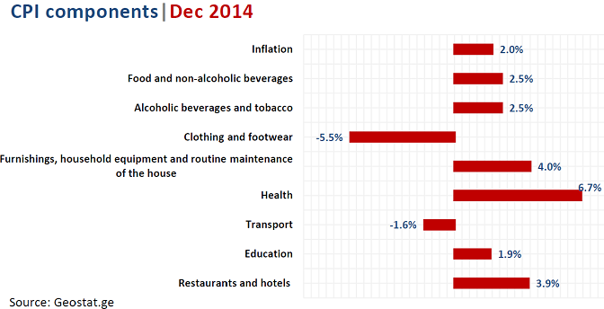 Recent Khachapuri Index dynamics are consistent with GeoStat-reported general Consumer Price Inflation (CPI), which also increased in December – by 0.7% in monthly terms and 2% y/y. CPI inflation was mostly driven by price increases in such categories as “health” (up by 6.7%), “furnishing, household equipment and routine maintenance of the house” (4%), “restaurants and hotels” (3.9%), “food and non-alcoholic beverages” and “alcoholic beverages and tobacco” (2.5%). It is worth noting that, for much of 2014, prices in the “clothing and footwear” category have, on average, remained about 5.5% below their previous year level.