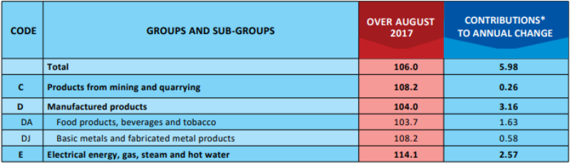 The Financial — In August 2018 the Domestic Producer Price Index for Industrial Products (DPPI) increased by 0.5 percent compared to the previous month. In the mentioned period prices increased by 0.7 percent for manufactured products, while the prices decreased by 0.2 percent for electrical energy, gas, steam and hot water. Compared to August 2017 the DPPI increased by 6.0 percent. There was a 4.0 percent increase in the prices for the group of manufactured products. The prices increased by 14.1 percent for electrical energy, gas, steam and hot water and by 8.2 percent for the products from mining and quarrying. The following table shows DPPI for August 2018, compared to the same month of the previous year, as well as the contributions of sub-groups that had a major effect on the index.