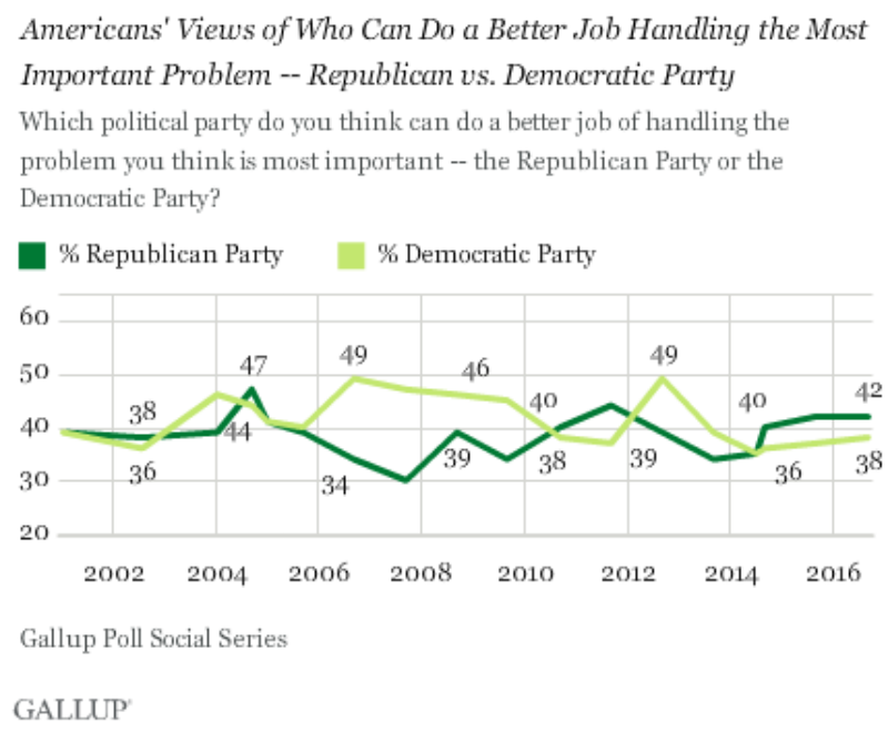 Potentially helpful for the Republicans, including Trump, is the slight edge Republicans have over the Democrats in Americans’ view of which party can better handle the issue they named as the top problem. While similar to the results in 2014 and 2015, it is a markedly better positioning for the GOP than in recent presidential election years, when the Democrats enjoyed a strong edge on this question.