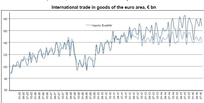 In January to July 2016, euro area exports of goods to the rest of the world stood at €1 173.9 bn (a decrease of 2% compared with January-July 2015) and imports at €1 013.3 bn (a decrease of 4% compared with January-July 2015). As a result, the euro area recorded a surplus of €160.6 bn, compared with +€140.9 bn in January-July 2015. Intra-euro area trade fell to €994.2 bn in January-July 2016, down by 1% compared with January-July 2015.