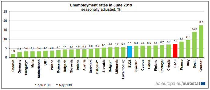 Among the Member States, the lowest unemployment rates in June 2019 were recorded in Czechia (1.9%) and Germany (3.1%). The highest unemployment rates were observed in Greece (17.6% in April 2019) and Spain (14.0%).