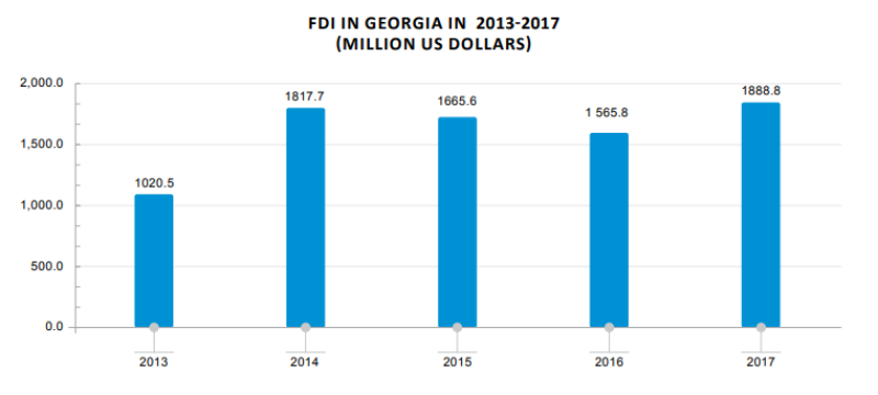 The FINANCIAL — Foreign direct investments (FDI) in Georgia amounted to USD 1888.8 million in 2017 (adjusted data) up 20.6 percent from the same data of 2016 and up 1.4 percent from the preliminary data of 2017.