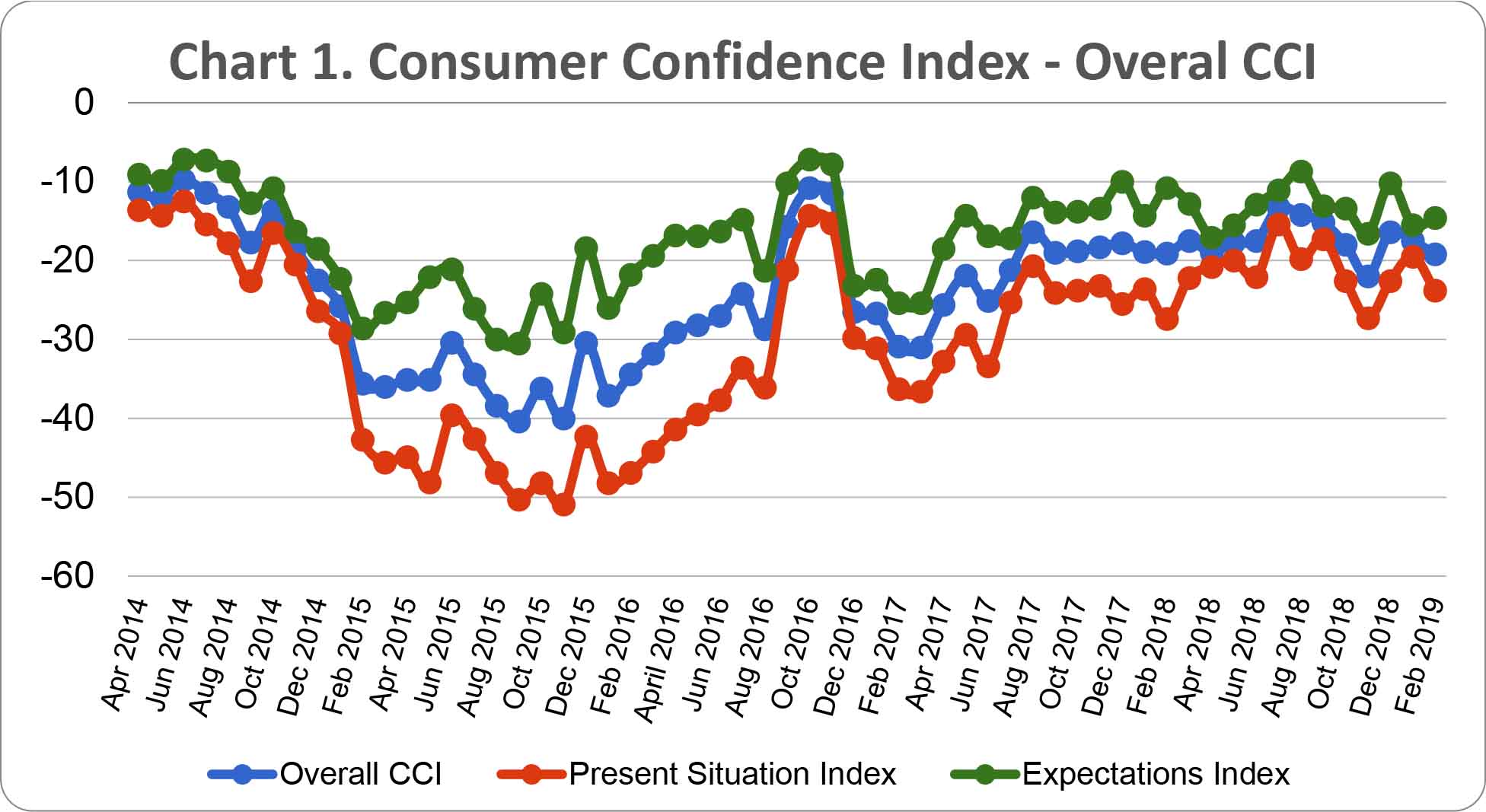 The FINANCIAL — According to a nationally representative sample of 341 Georgians interviewed in late February 2019, the Consumer Confidence Index (CCI) dropped by 1.7 index points, from -17.5 in January to -19.2 in February. This dip was driven by the Present Situation Index, which fell from -19.5 to -23.8. The Expectations Index instead rose by 2.9 index points (from -17.5 to -14.6) compared to January. Apparently, the end of the winter blues had a positive effect on Georgian consumers’ expectations about the future in a context in which the Present Situation Index deteriorated for the first time in three months.