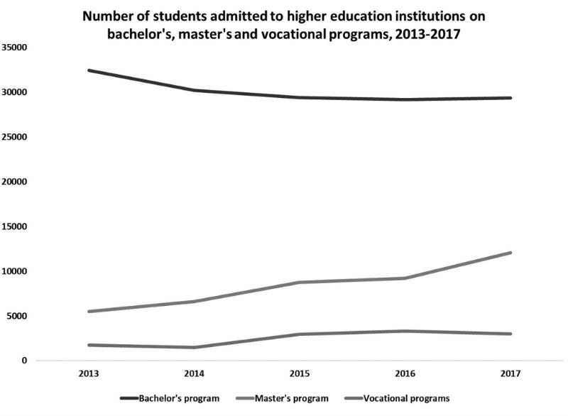 Due to the challenges in admitting more students at bachelor’s level, the number of students admitted to master’s degrees has been increasing since 2013 (annual 22% increase on average in the last five years). In this case, students are also ready to study on relatively low-quality master’s programs due to formal labor market requirements and inadequate regulation of the military service institute in Georgia.