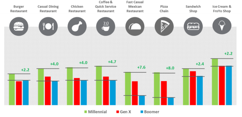 According to Harris Poll’s research, when analyzing restaurant brand equity by generation, Coffee and Quick Service Restaurant brand equity is nearly 5 points (+4.7) higher among millennials compared to baby boomers, while Casual Dining and Chicken restaurants are each four points higher. Conversely, Pizza (-8.0) and Fast Casual Mexican (-7.6) restaurants see a marked gap among baby boomers, pushing the overall equity for these restaurant categories below average. Since brand equity tends to resist movement, the equity gains and declines among restaurant brands is significant.