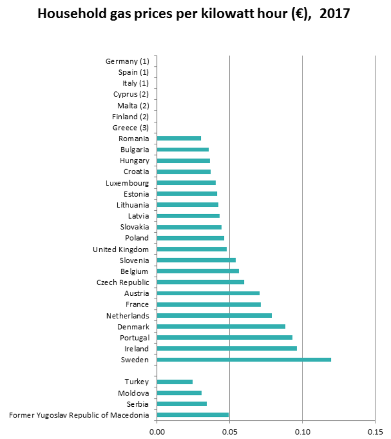 The price per kilowatt hour of household gas is generally lower than the price of household electricity and in 2017 ranged from 3 cent (Romania) to 12 cent (Sweden). In most of the 21 Member States that were able to provide the data, the price was below 8 cent per kilowatt hour.