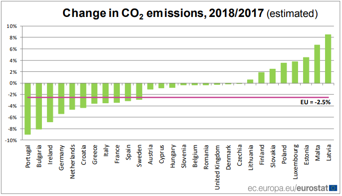 MoreThe FINANCIAL -- Eurostat estimates that in 2018 carbon dioxide (CO2) emissions from fossil fuel combustion significantly decreased by 2.5% in the European Union (EU), compared with the previous year.