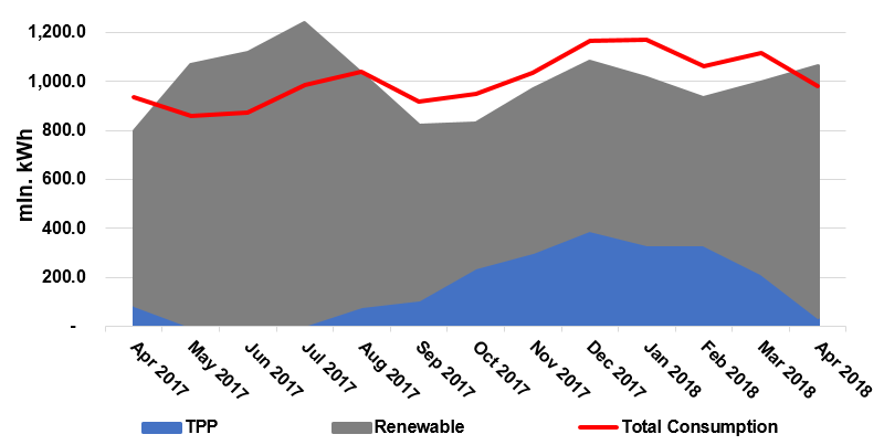 Energo-Pro Georgia is the largest consumer of electricity. The share of electricity consumed by Energo-Pro Georgia has been increasing over the years (See Figure 3). In April 2018, it had the highest share in comparison to previous years (in the same month).
