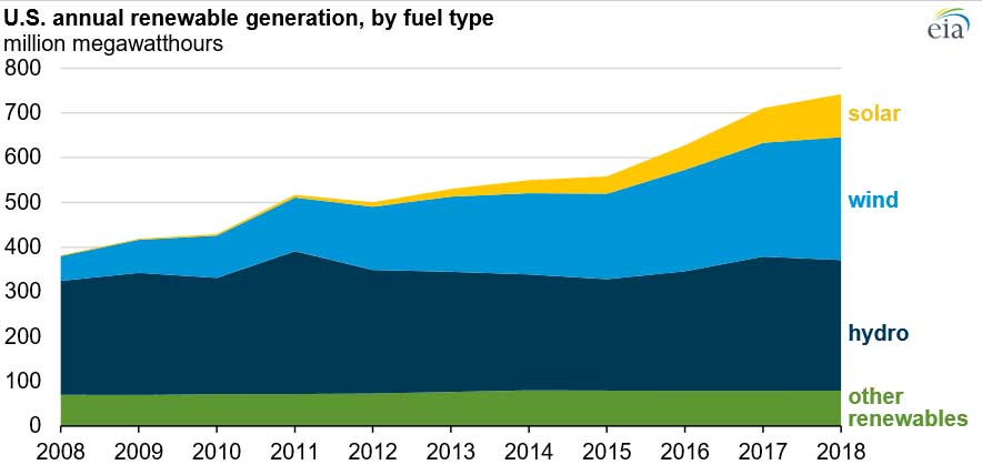 The FINANCIAL — Renewable generation provided a new record of 742 million megawatthours (MWh) of electricity in 2018, nearly double the 382 million MWh produced in 2008. Renewables provided 17.6% of electricity generation in the United States in 2018.
