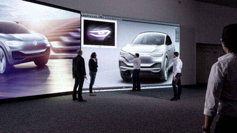 Volkswagen Design has been engaging with the topic of digital working methods for a number of years – a major project. Thus investments have been made in extensive high-end presentation systems – such as an 18-metre wide high-resolution LED screen for the acceptance of virtual models.